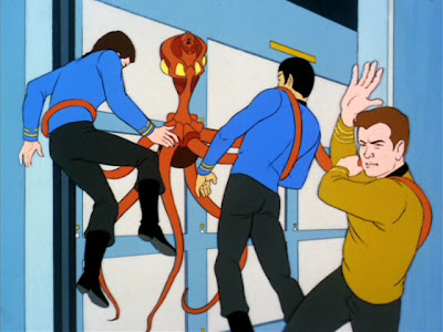 But not all is as it appears. Carter's former fiancee (voiced by Nichelle Nichols) is serving aboard Enterprise, but Carter tells her that he can never marry her and refuses to provide any explanation. Then, when Kirk is discussing details of Carter's damaged ship, the man disappears - replaced by an octupus-like alien, which reduces Kirk to unconsciousness. When the alien vanishes, a duplicate Kirk stands in its place.